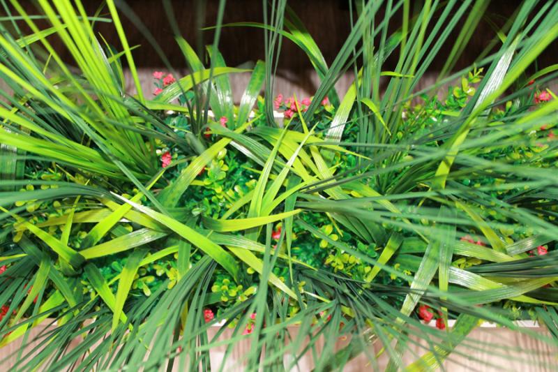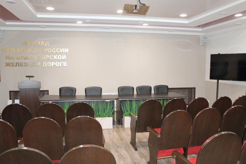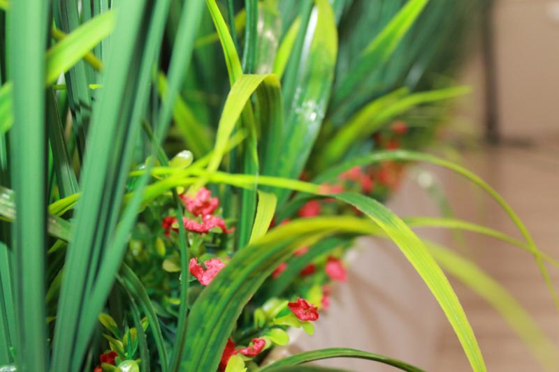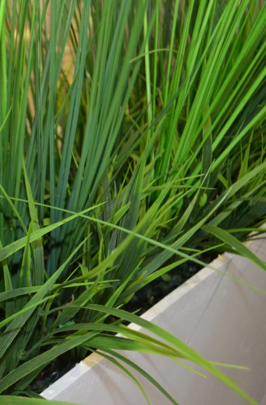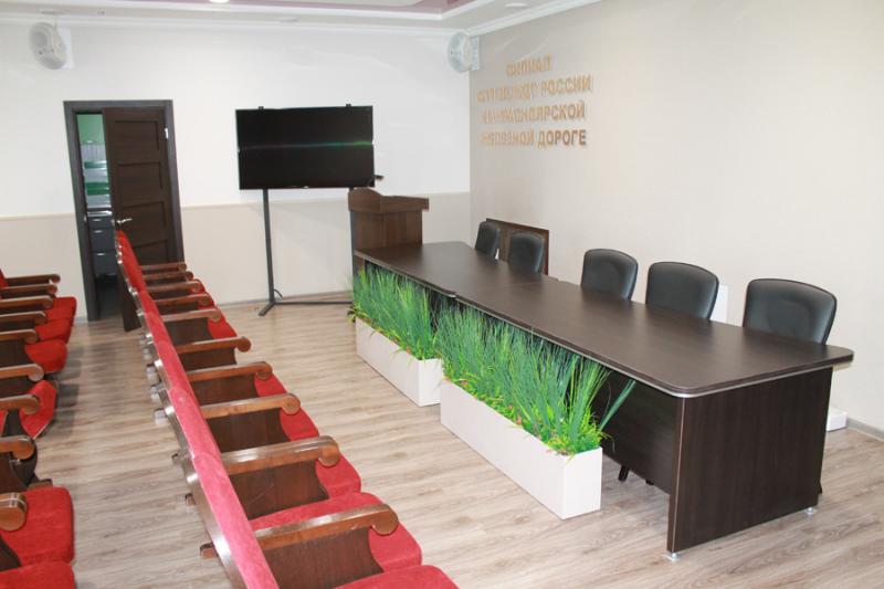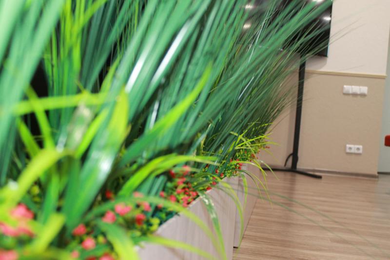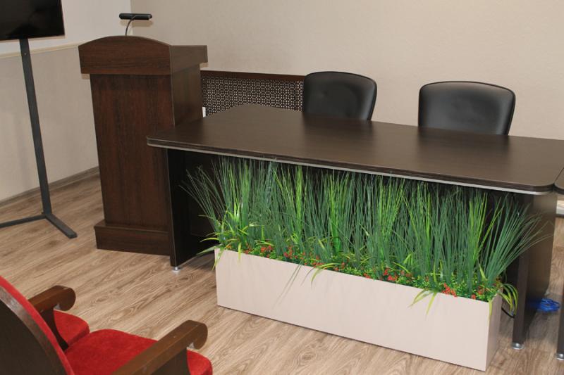 Фитодизайн офиса строгий и лаконичный. Безусловно, он отличатся от озеленения квартиры или дома. Здесь несколько иной подход и чаще всего рекомендуется использование искусственных декоративных растений. Озеленение должно создавать ощущение уюта и комфорта, но в тоже время не должно отвлекать сотрудников от их деятельности. Для филиала ФГП ВО ЖДТ России на Красноярской железной дороге мы изготовили короба с зеленой травой (130х40х20см). Контейнеры были покрашены в цвет стен конференц-зала (капучино), а в поддержку красной оббивки кресел мы добавили в траву немного красных цветов гипсофилы.
