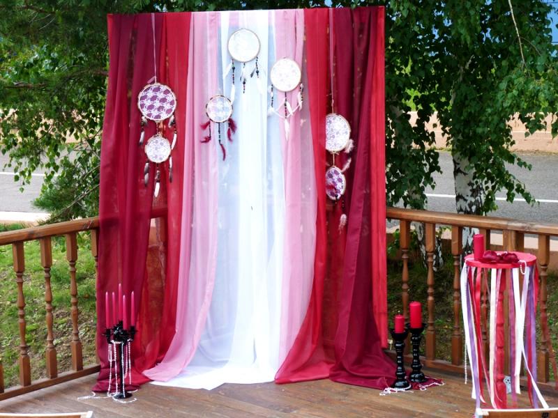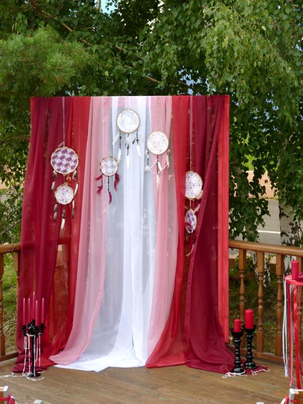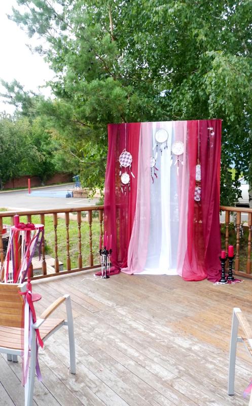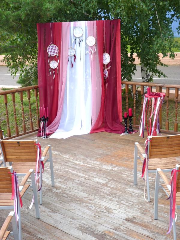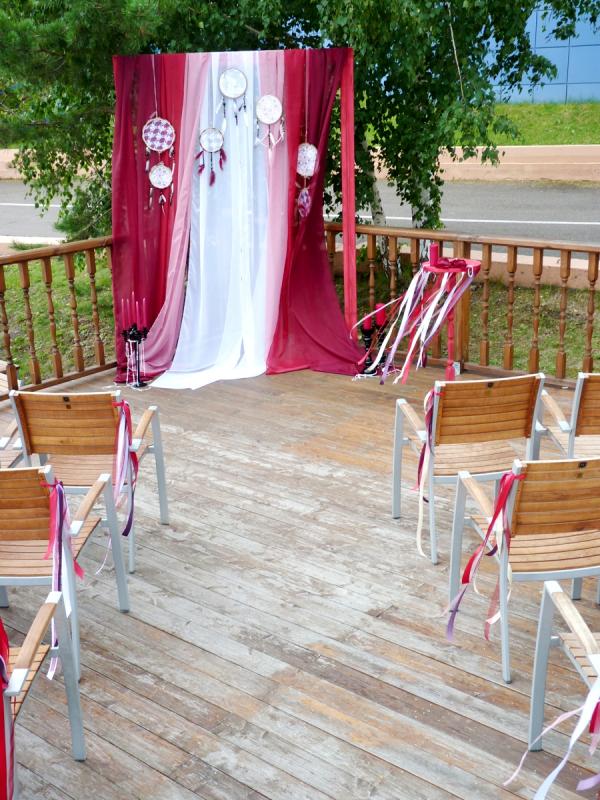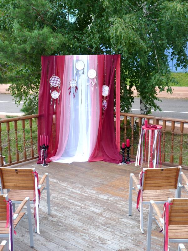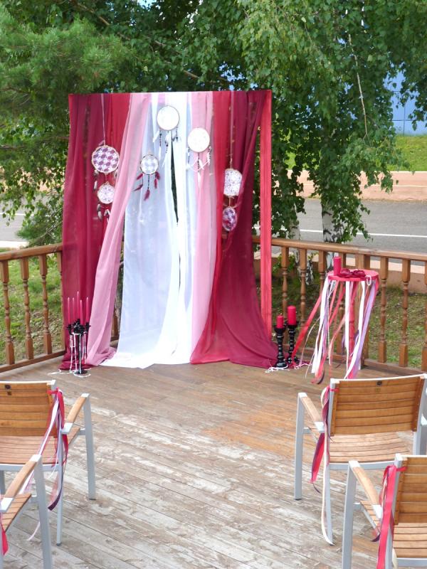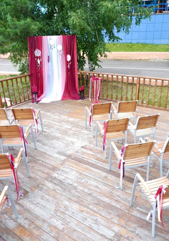 Свадьба в цвете Марсала для прекрасных молодоженов Александра и Светланы Коваленко. Торжество состоялось 1 августа 2015 года и проходило за городом в ресторане "Михайлов" (Очень рекомендуем! г. Красноярск, ул. Свердловская, д.289/стр.33). Арка для выездной регистрации была оформлена легкой тканью с переходом цвета марсала ("омбре"). Таинственности и загадочности придали "ловцы снов" и черные благородные канделябры со свечами и нитями стекляруса. Выездная регистрация проходила на открытой террасе. И кстати, погода в этот день была к нам благосклонна! Как только завершилась регистрация, начался дождь!!! Зал был оформлен цветочными композициями в высоких вазонах, будто парящих в воздухе. Президиум жениха и невесты был декорирован лентами, эвкалиптом и орхидеями цвета марсала. Стол молодоженов украсили бутылки, семейный очаг и книга пожеланий, в которой гости написали теплые слова молодоженам. Мы не стали придерживаться какого-то конкретного стиля в декоративном оформлении свадьбы. У нас получился коктейль стилей эко, рустик и бохо. И радостно, что гости и виновники торжества наш труд оценили!!! Для справки: Цвет Marsala это неяркий, теплый, сложный, благородный оттенок. Марсала - это вино, производимое на юге Сицилии. Марсала – сытный и стильный тон, становится повсеместно привлекательным, легко прижился в моде, красоте и промышленном дизайне, домашней обстановке и интерьере