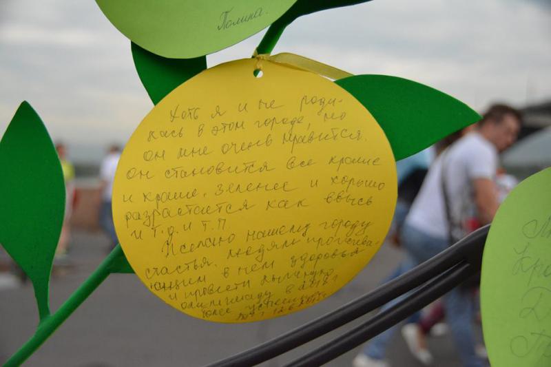 Наша студия принимала участие в Дне Города 2015г. Для площадки "Улыбающийся город" нами было изготовлено Дерево в кубе, символ студии. В котором каждый листик символизировал пожелание. Все горожане, которые проходили по набережной оставляли свои "листочки"! Это были слова благодарности городу, людям и мечты о сокровенном! Позже дерево переехало на постоянное место жительства в Управление культуры г. Красноярска. Мы были рады участию!