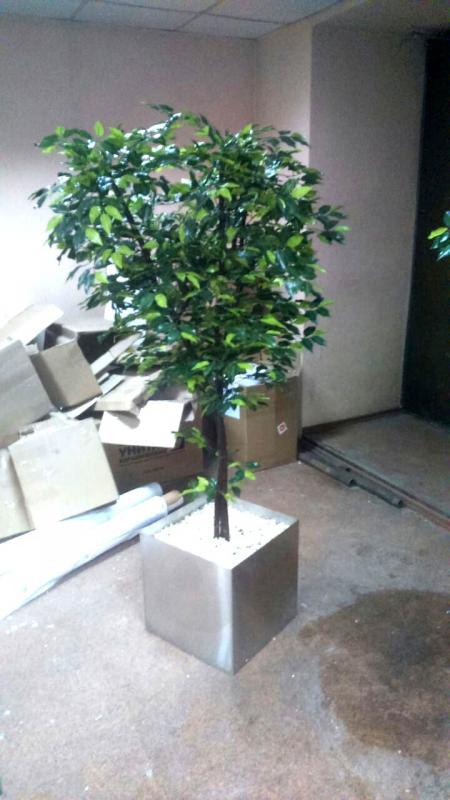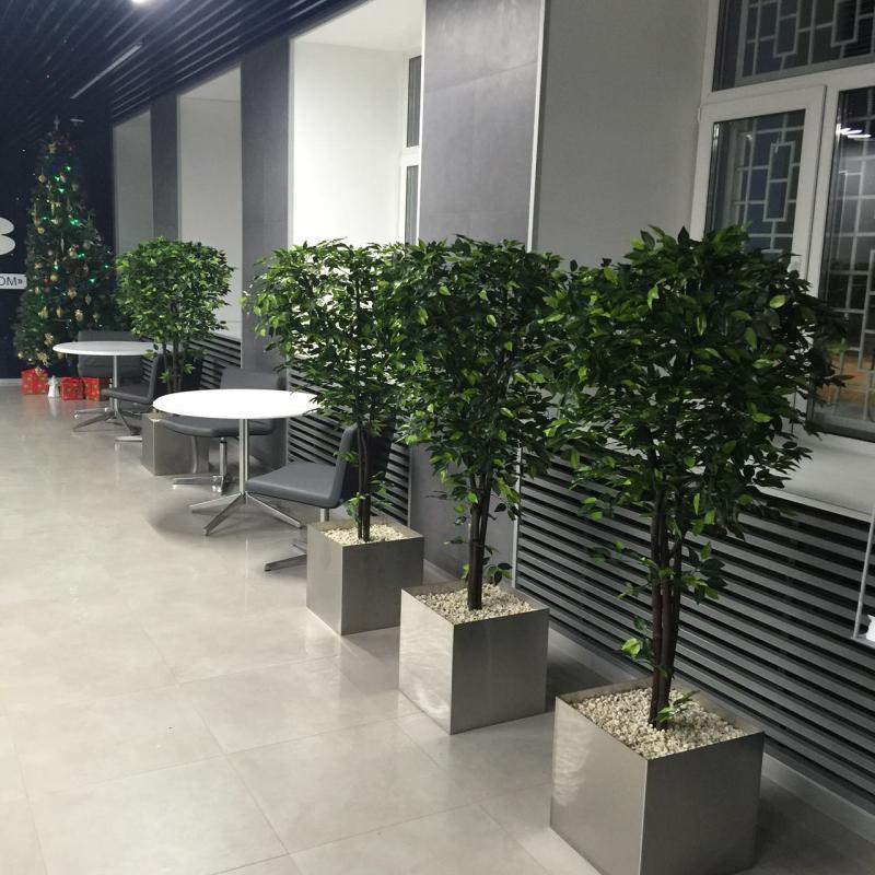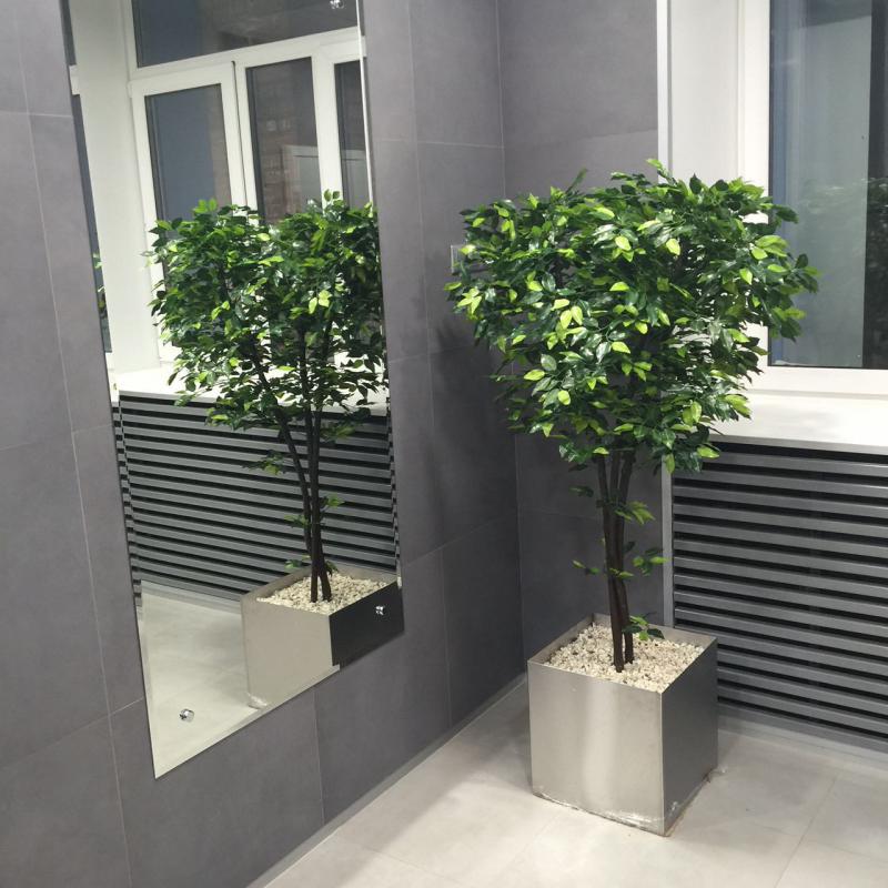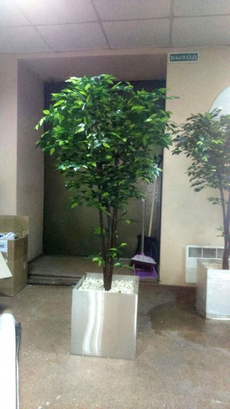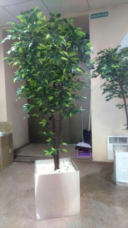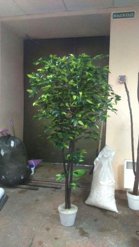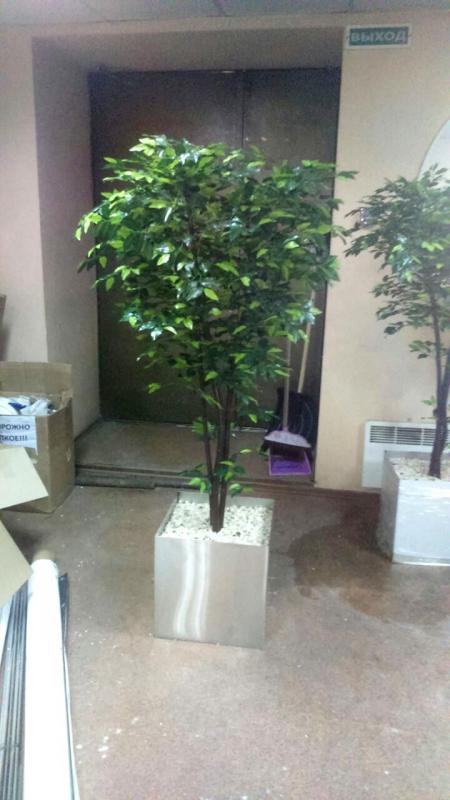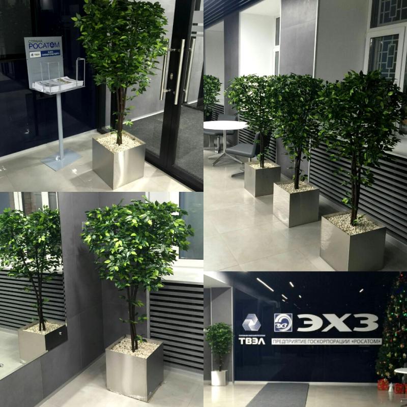 Фикусы искусственные для ЭХЗ Твэл (Зеленогорск). Деревья многоствольные, с ярко зеленой листвой. Высота дерева без кашпо h160 см.