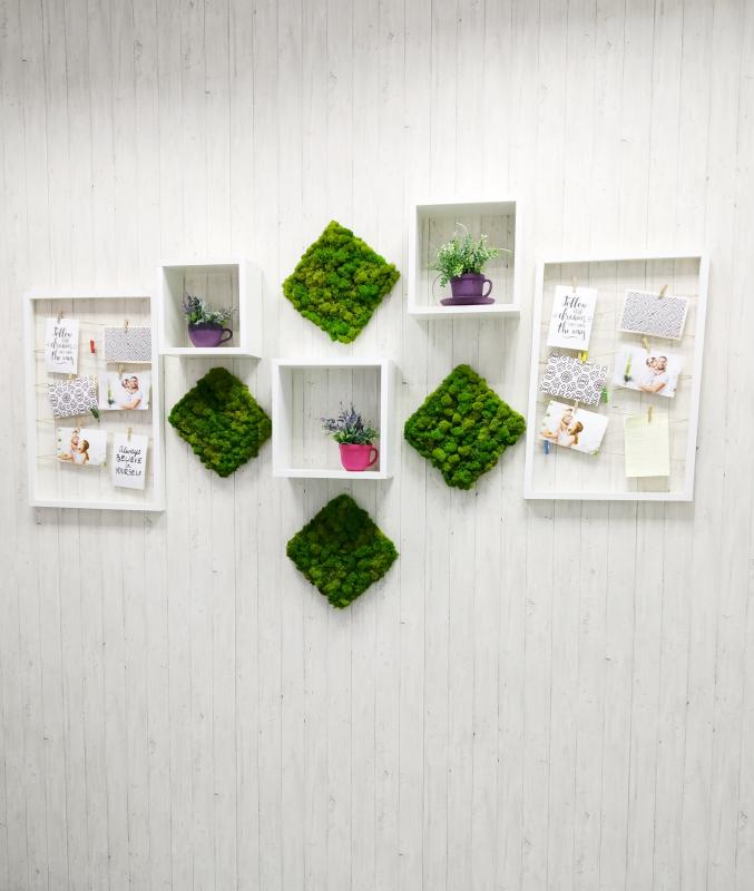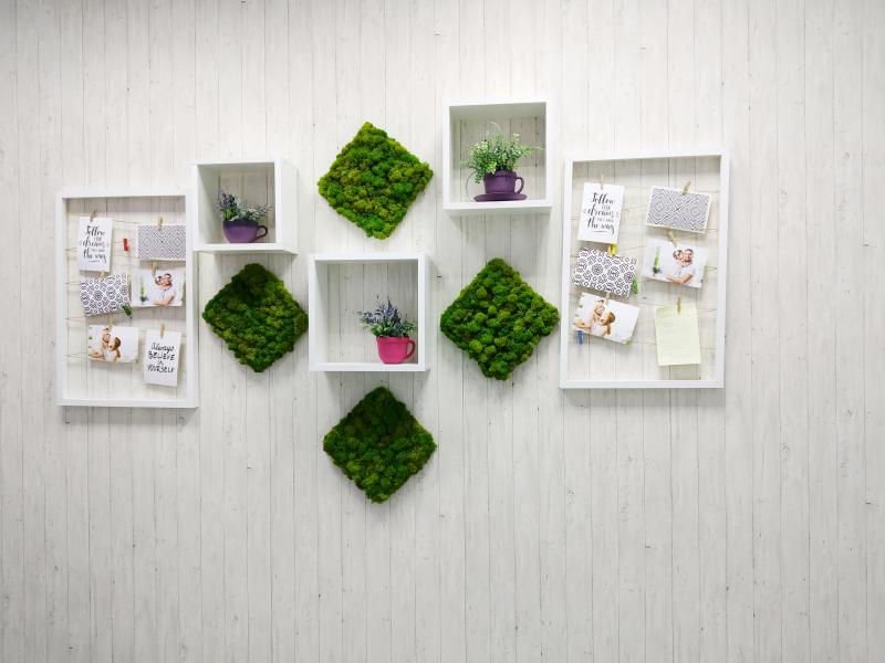 Перед нами стояла задача оживить проходную часть холла с салоне красоты. Так как стена большая, более 4 метров и посетители зачастую пробегали этот участок довольно быстро. Однако хозяева салона озадачились расширить зону своего благоприятного влияния на гостей. На стене разметили рамы с позитивными и мотивирующими картинками. Затем появились квадратные полочки, на которые мы поставили кружки с цветами. А в качестве завершающей точки мы предложили ромбы из стабилизированного мха. Теперь в этой части холла посетители останавливаются, делают селфи и даже оставляют записки с пожеланиями для мастеров салона. Таким образом мы можем честно признаться, что с задачей справились! Желаем салону процветания и благодарных клиентов) Вы можете лично посмотреть на нашу работу по адресу: г. Красноярск, ул. Красной Армии, д. 18. т.к. 89080259191; 89620730220 или 89135621015 (салон красоты Ежевика).