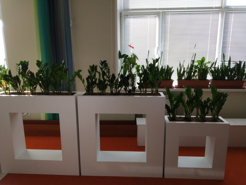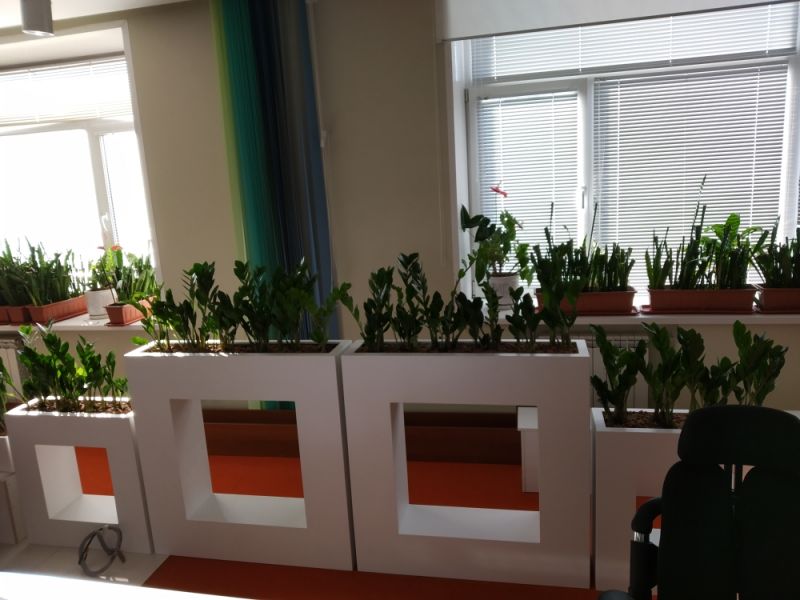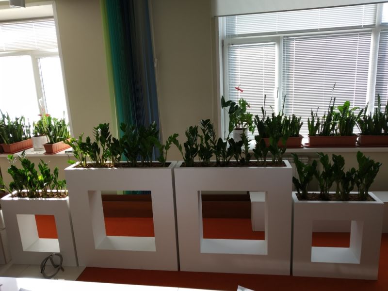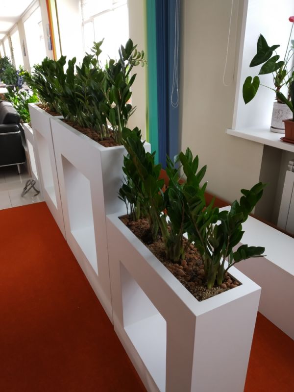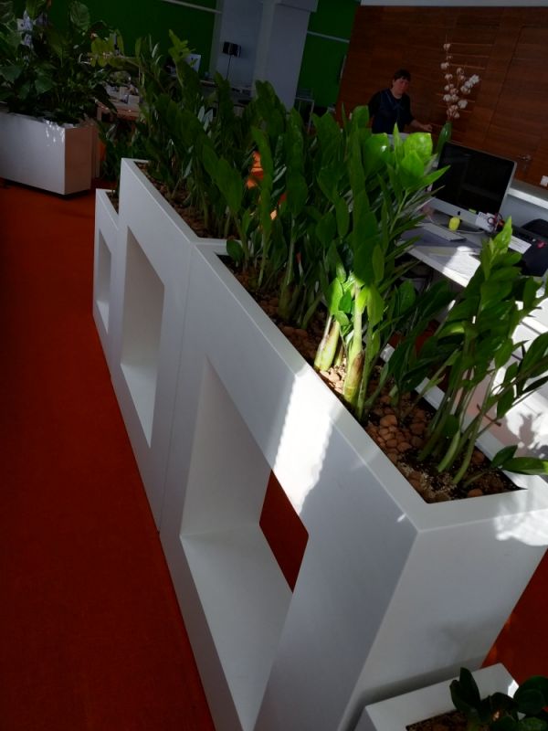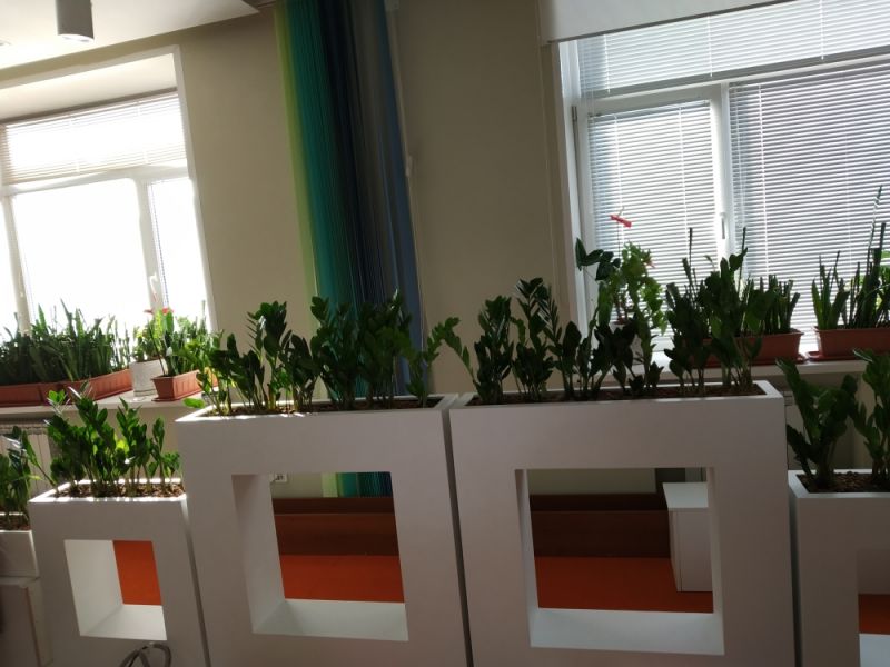 Фитодизайн - это прекрасное решение зонирования для офиса. Ярким примером тому - озеленение АО "Горные Машины". Задача была оформить и зонировать ресепшн. Для проекта были изготовлены дизайнерские кашпо прямоугольной формы. Растениями для озеленения были выбраны замиокулькасы. В настоящее время наше сотрудничество с компанией АО "Горные машины" продолжается уже в качестве клиентов по обслуживанию и уходу за растениями (биологический контроль).