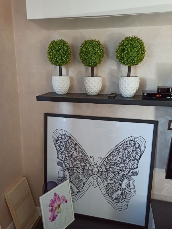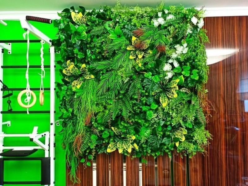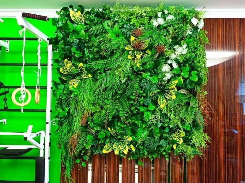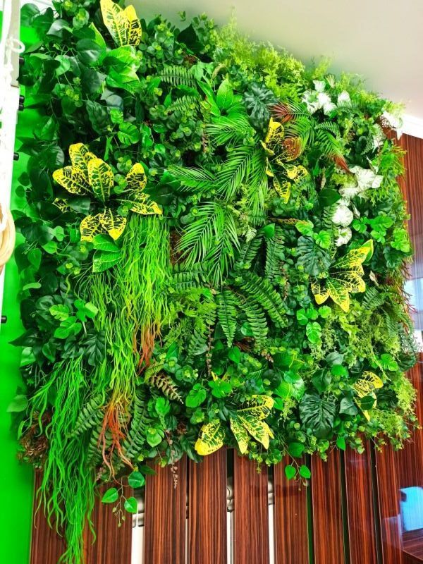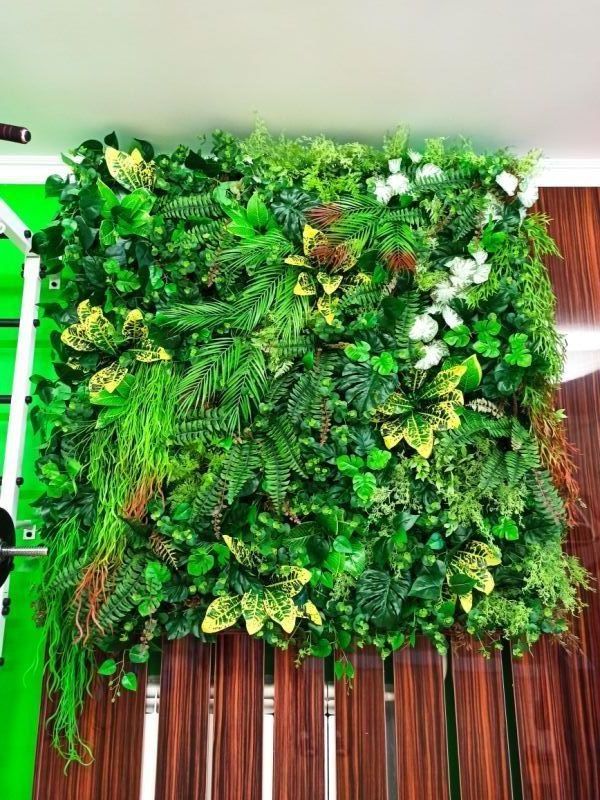 Основной задачей было озеленить спортивный зал в доме. Ранее на стене висела фитокартина с живыми (горшечными) растениями. Однако из-за недостаточного освещения растения стали гибнуть, соответственно требовалось постоянное внимание (заменять горшки и обращаться за помощью биолога). Клиентка (уже постоянная) решила, что единственным верным решением будет заменить живые цветы на искусственные. Нами было иготовлено панно с искусственными растениями (ботаническими копиями). Размер: 160*153см.