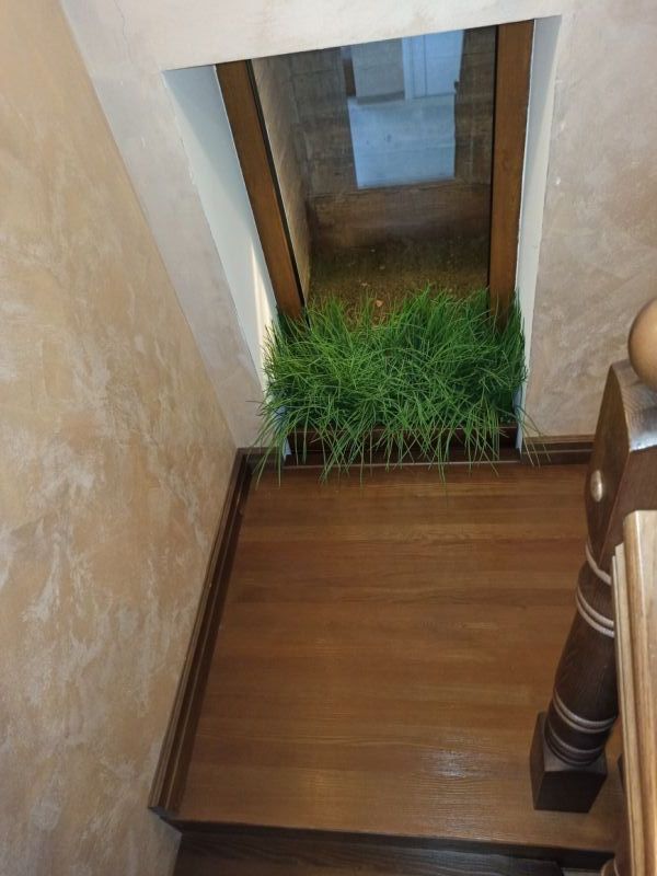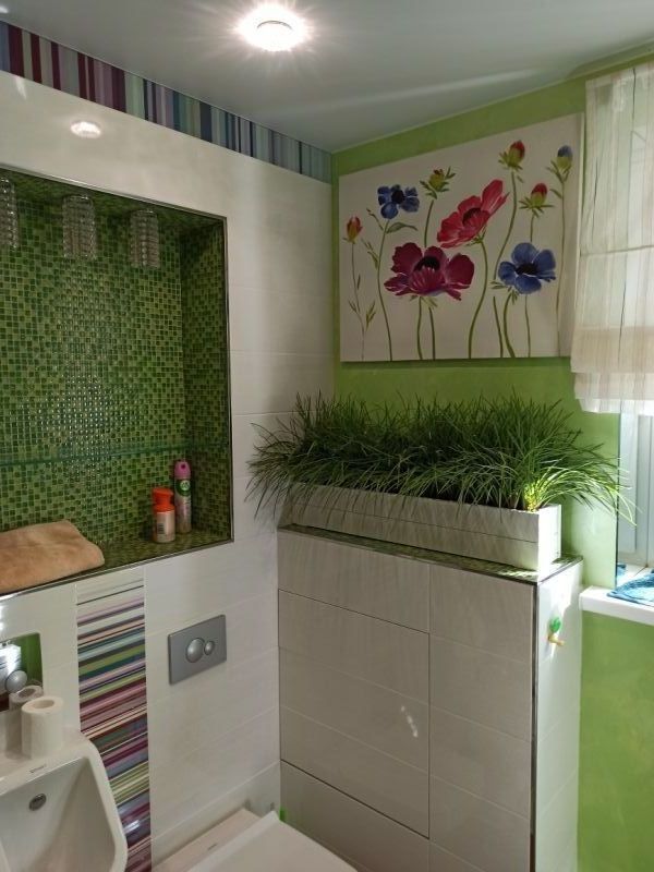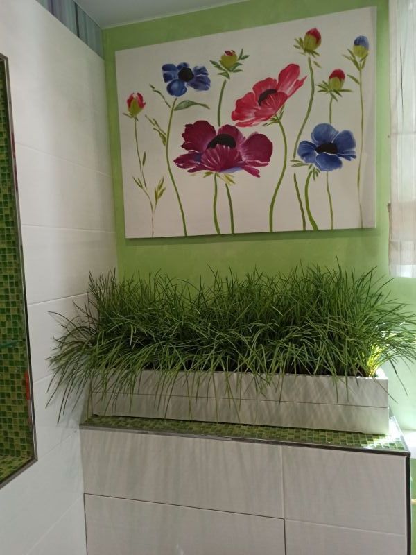 В интерьере озеленяли акцентно - ванную комнату, коридор (короба с травой) и собрали мини-самшиты для полки в гостинной.