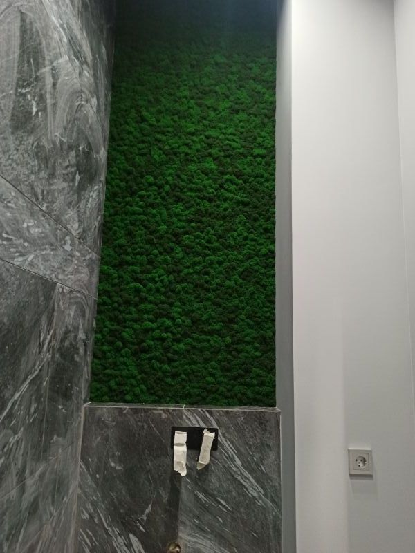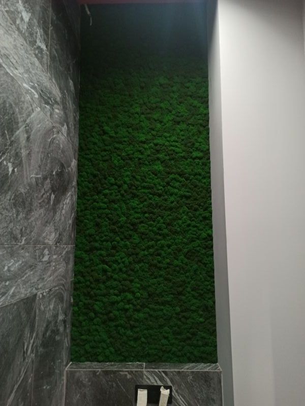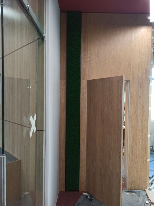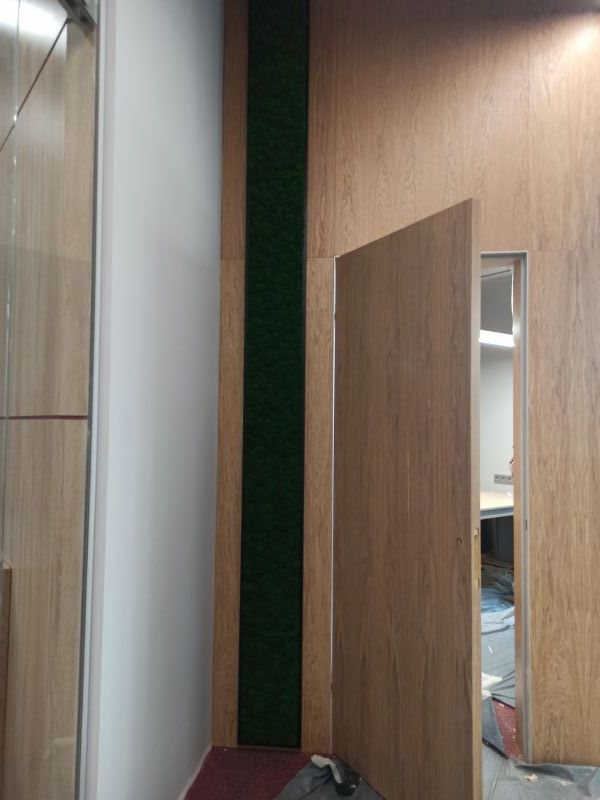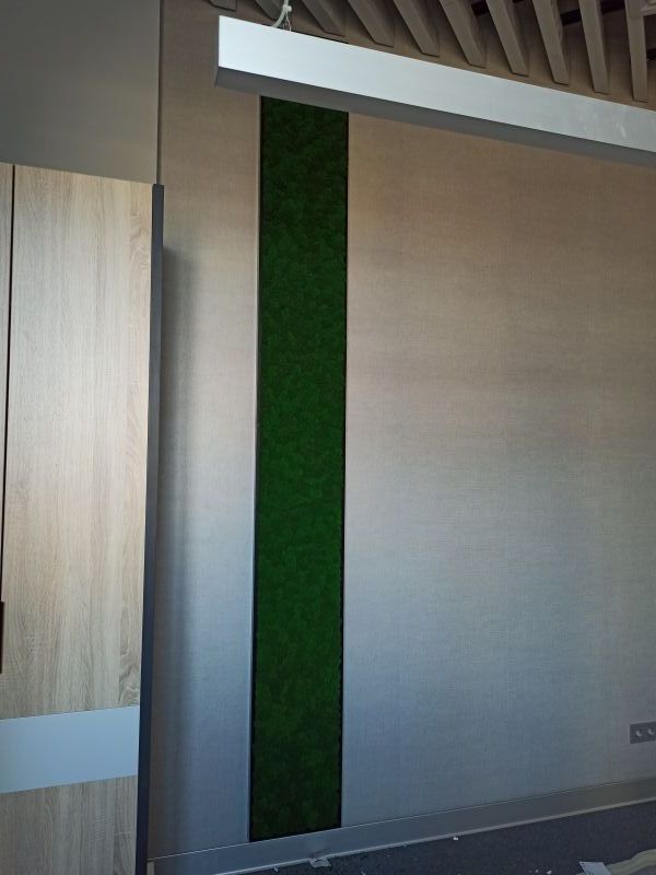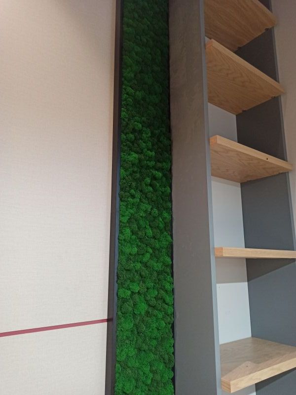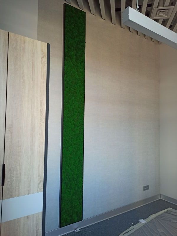 Офисное пространство по задумке дизайнера было декорировано мхом. Мы выбрали из палитры натуральные цвета мха, что подчеркнуло имеющиеся в проекте природные (натуральные) материалы.