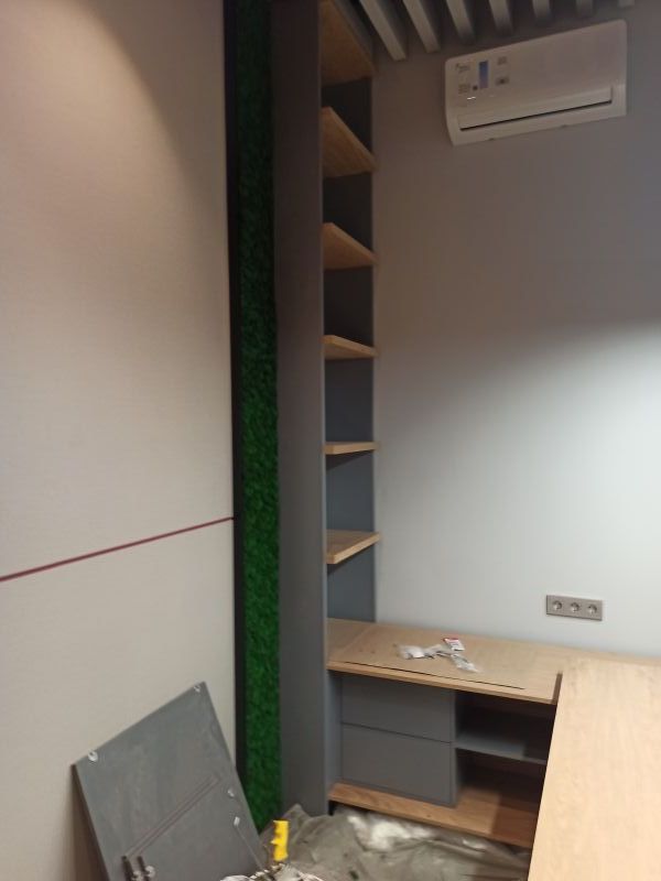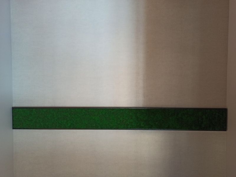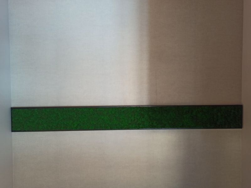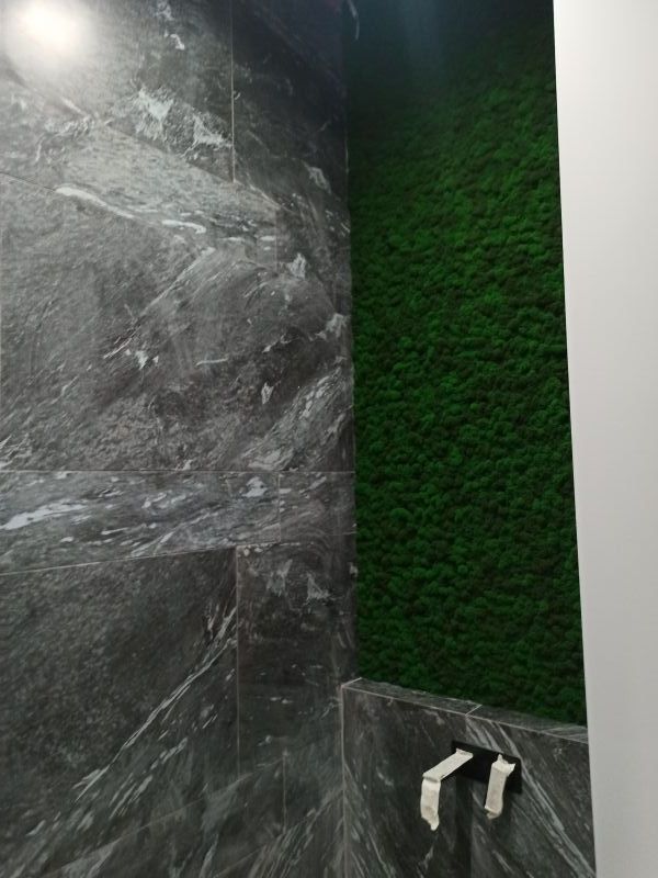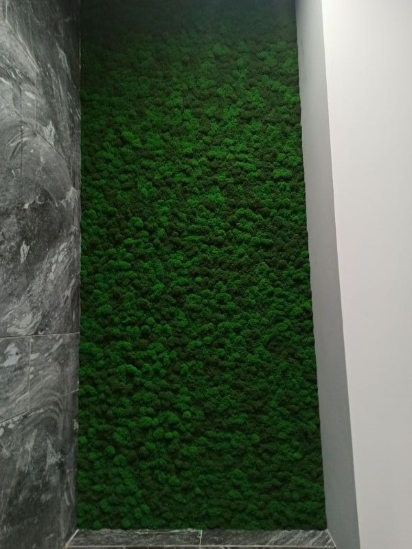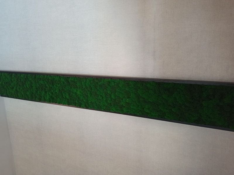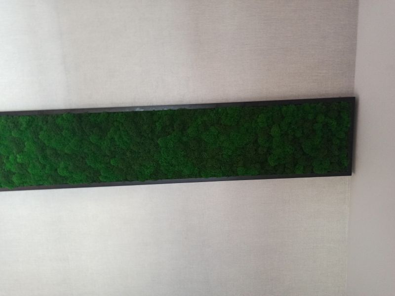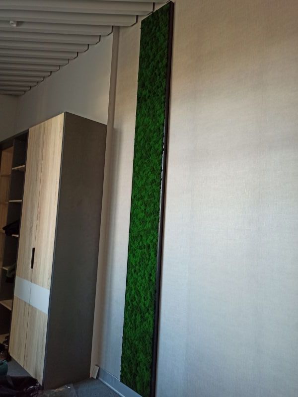 Офисное пространство по задумке дизайнера было декорировано мхом. Мы выбрали из палитры натуральные цвета мха, что подчеркнуло имеющиеся в проекте природные (натуральные) материалы.