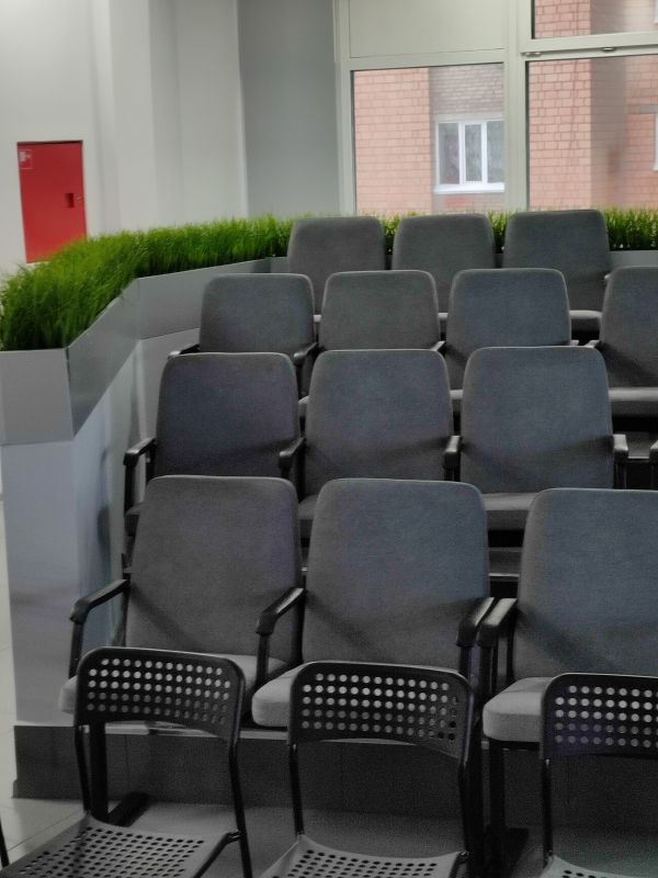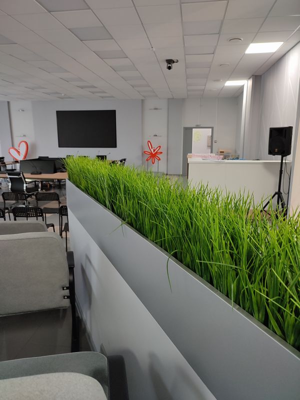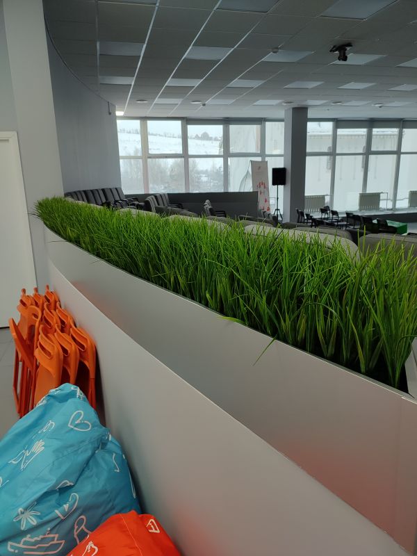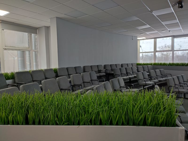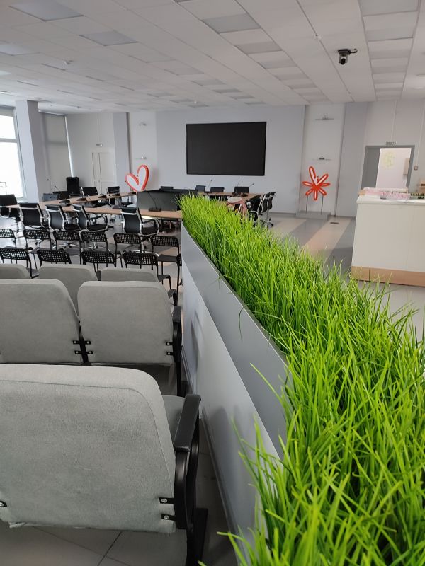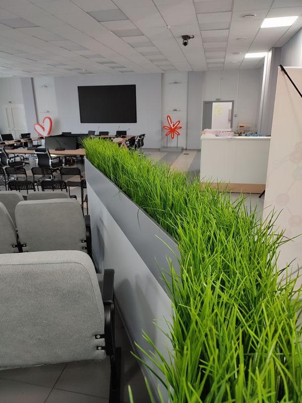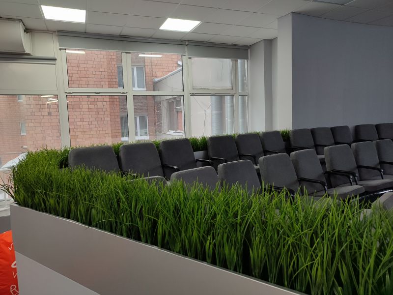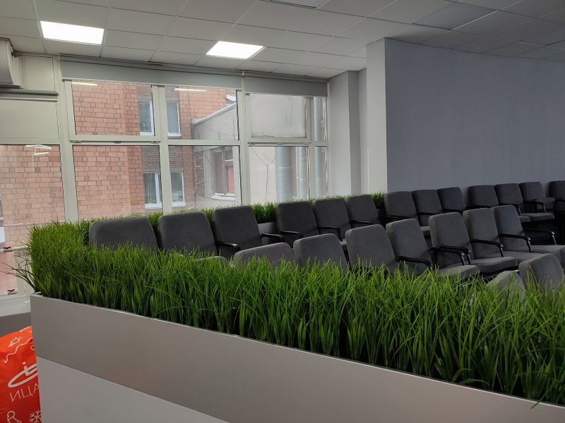 Небольшой зеленый акцент для конференц - зала АНО ИЦАО. Озеленение искусственной травой осокой внесло живость и яркость в монохромный интерьер.