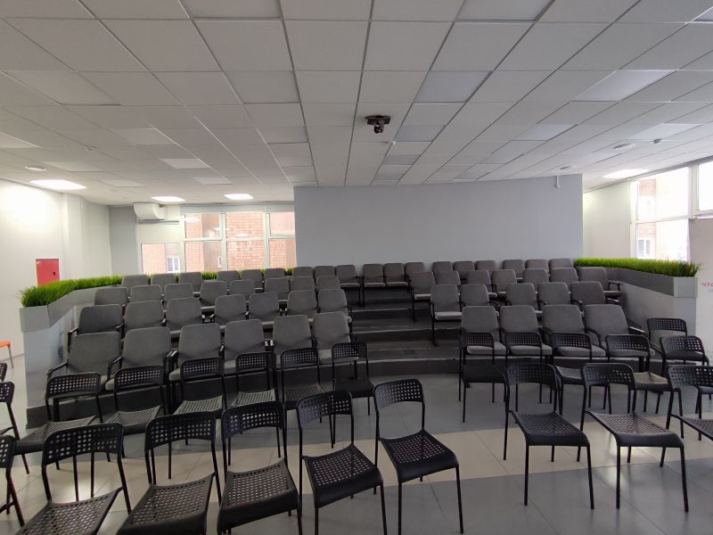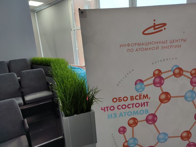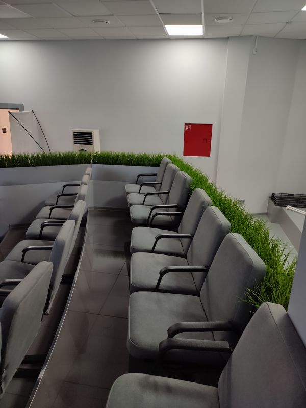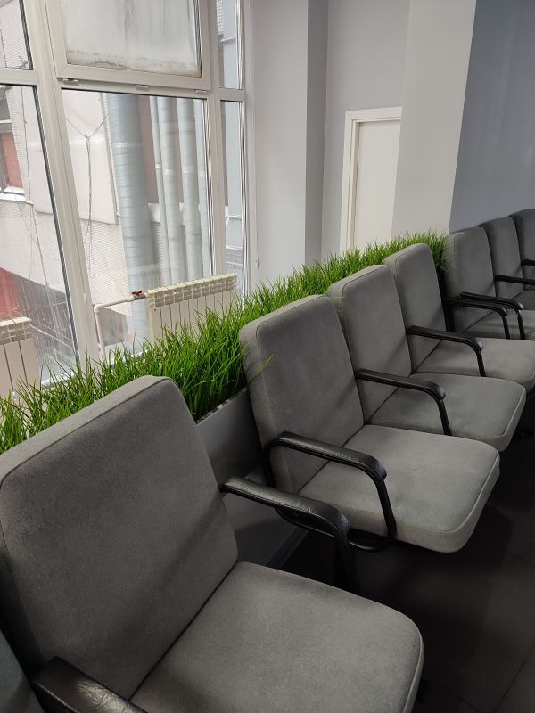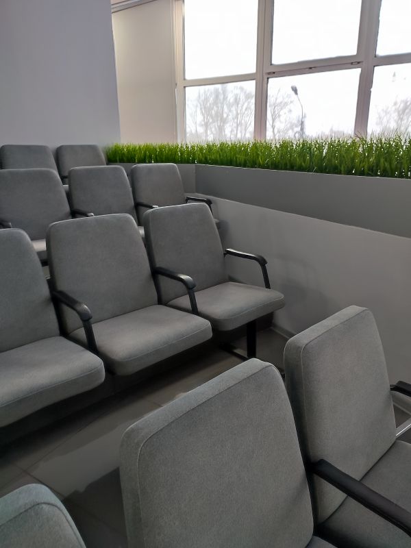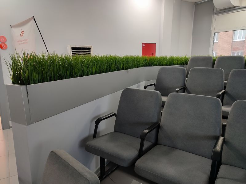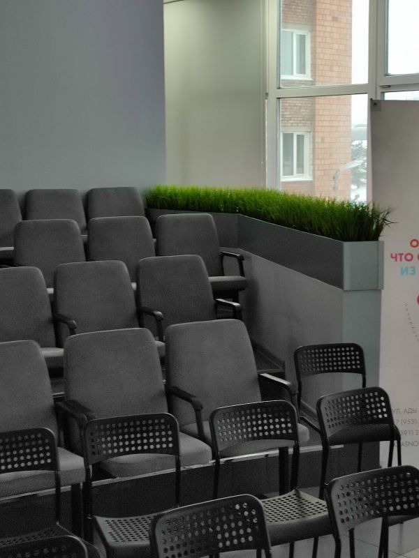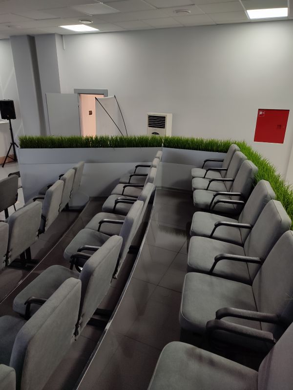 Небольшой зеленый акцент для конференц - зала АНО ИЦАО. Озеленение искусственной травой осокой внесло живость и яркость в монохромный интерьер.