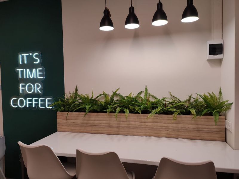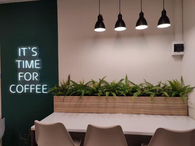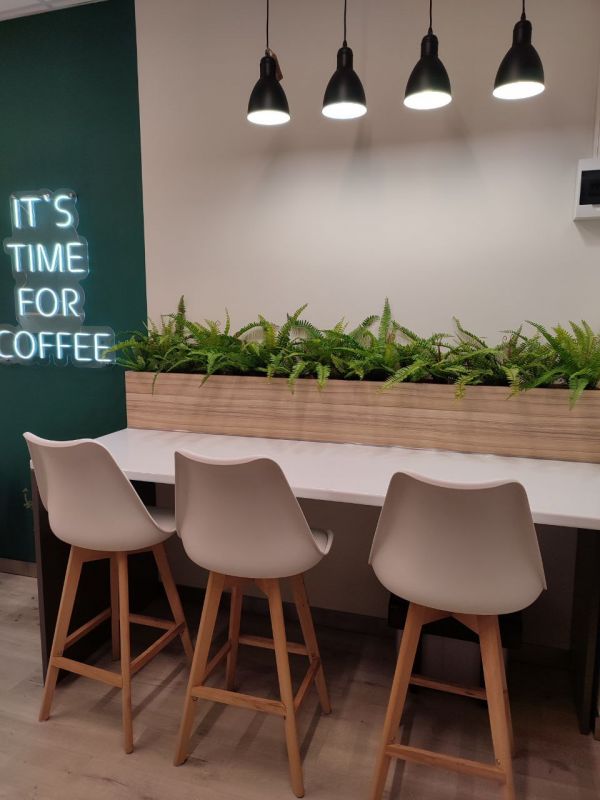Для зеленого акцента в зоне кофейни были выбраны папортоники. Именно их текстура и резной лист подчернули уютную атмосферу пространства. Растения существенно изменили весь интерьер;) Один штрих и все вокруг ожило!