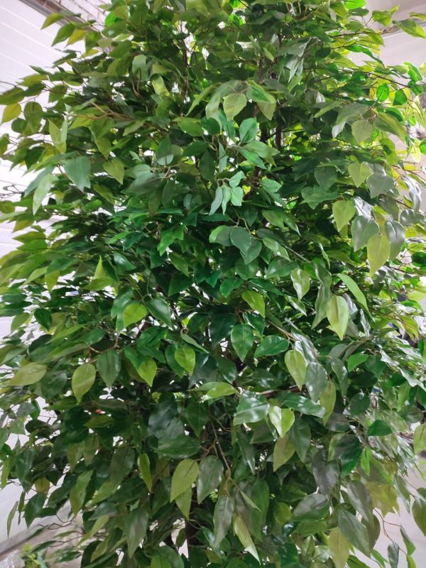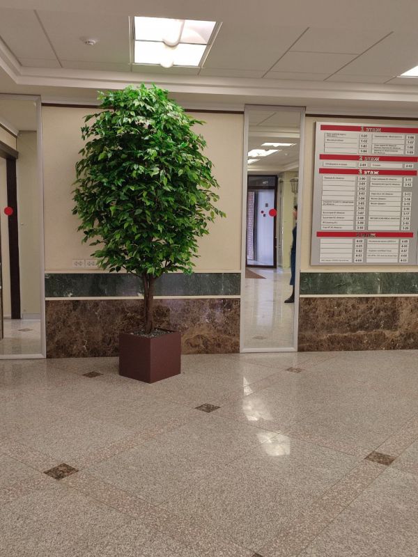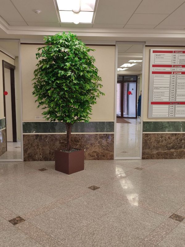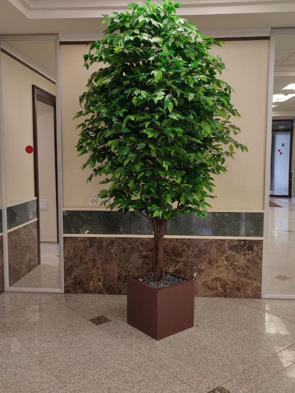 Фикус -крупномер (высота 3,5м) в дизайнерском кашпо украсил фойе обувной фабрики "Ионесси". Полностью ручная работа. Дерево искусственное на натуральных стволах (переплетенных). Кашпо кубической формы, его цвет подбирали по Ралу учитывая имеющийся интерьер. От момента заключения договора и реализации прошло 14 дней. Обращайтесь, будем рады помочь!